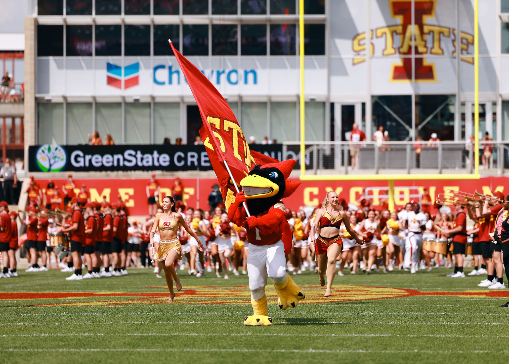 Cy is the official mascot of Iowa State University, and his duties are fulfilled by the members of the Mascot Squad. Cy makes appearances at various Cyclone sporting events such as football, men's and women's basketball, volleyball, wrestling, soccer, softball, and gymnastics. In addition to sporting events, Cy is often requested to make various appearances across the state of Iowa for a number of events. An interesting fact that you may not know is that Cy competes each year at the NCA College Mascot Nationals in Daytona Beach, Florida. Cy is part of the national routine performances, which helps improve the overall effect of the routines and improve scores. Cy also has a routine of his own where he performs a skit competing against other mascots in order to win over the crowd. The mascot squad works very hard to build the props and sets used in Cy's routine.