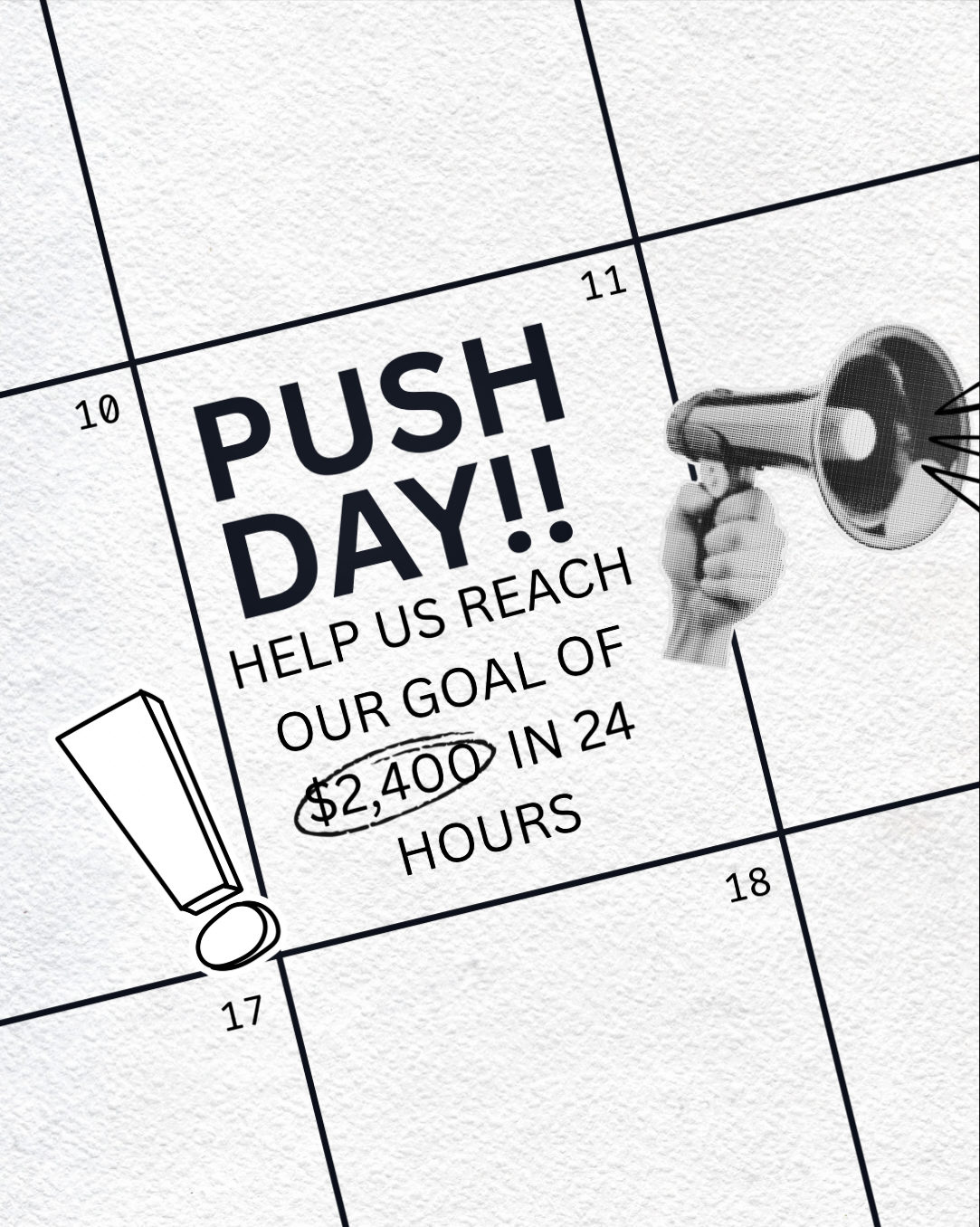 It is PUSH DAY! As of 7 PM tonight, we officially launched our 24-hour campaign with a goal of raising $2,400 to support The Fashion Show.